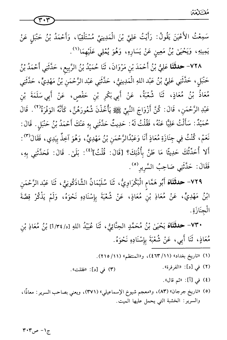 728 - حَدثنا علي بن أحمد بن مروان، حَدثنا حميد بن الربيع، حَدَّثني أحمد بن حنبل، حَدَّثني علي بن عَبد الله المديني، حَدَّثني عَبد الرحمن بن مهدي، حَدَّثني معاذ بن معاذ، حَدثنا شُعبَة، عن أبي بكر بن حفص، عن أبي سلمة بن عَبد الرحمن قال: كن أزواج النبي صَلى الله عَليه وسَلم يأخذن شعورهن كأنه الوفرة. قال حميد: سألت عَليًا عنه، فقلت له: حديث حَدَّثني به عنك أحمد بن حنبل، قال: نَعم، كنت في جِنازَة معاذ، أنا، وعَبد الرحمن بن مهدي، وهو آخذ بيدي فقال: ألا أحدثك حديثًا ما طن بأذنك؟ قال: قلتُ: بلى، قال: فحدثني به، فقال: حدثني صاحب السرير.
