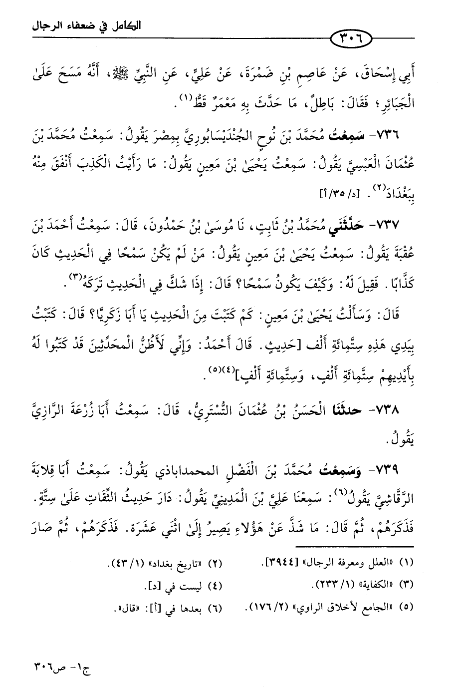 736 - سمعتُ مُحمد بن نوح الجنديسابوري بمصر يقول: سَمعتُ مُحمد بن عثمان العبسي يقول: سَمعتُ يَحيى بن مَعين يقول: ما رأيت الكذب أنفق منه ببغداد.