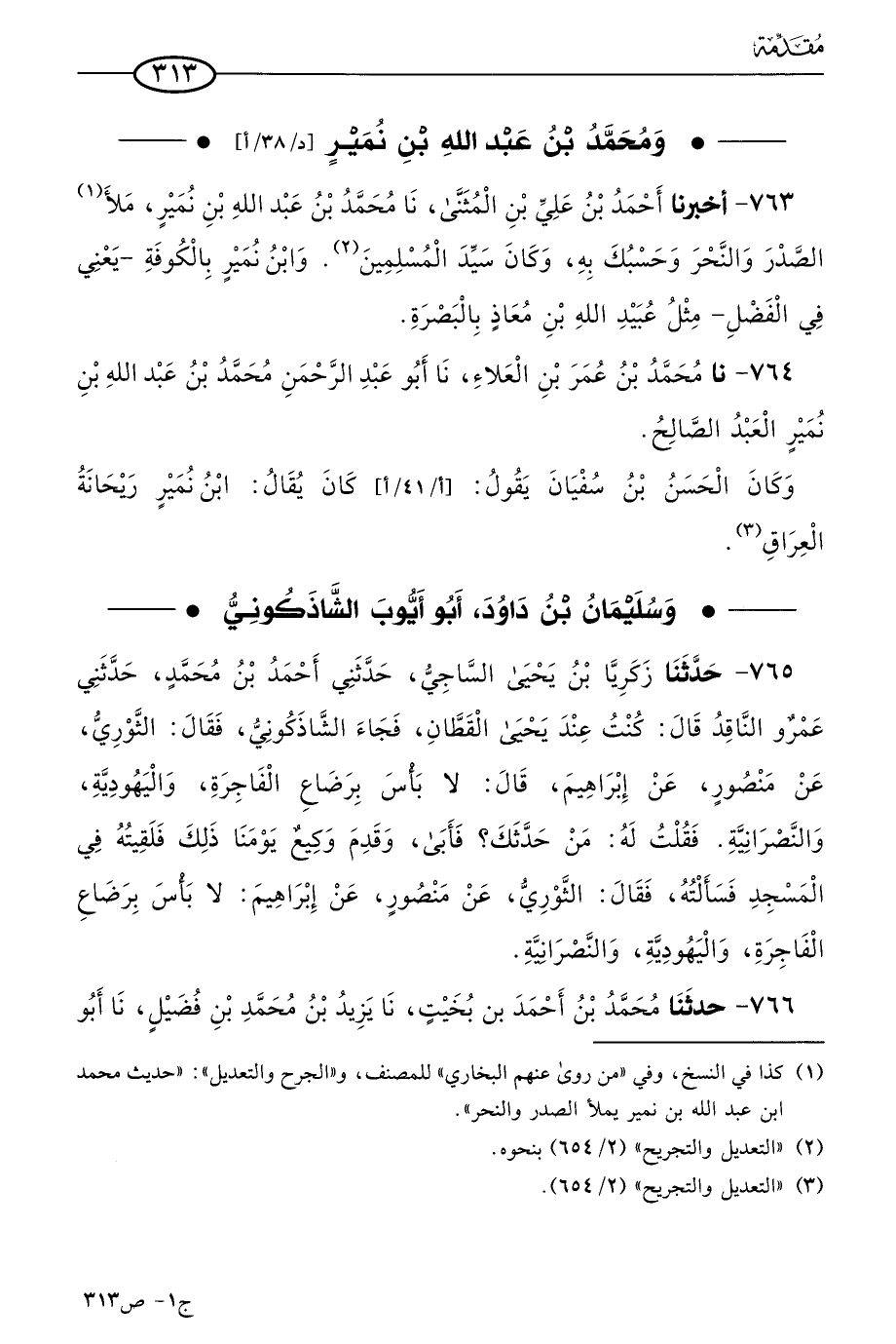 763 - أخبرنا أحمد بن علي بن المثنى، حدثنا مُحمد بن عَبد الله بن نُمَير، ملأ الصدر والنحر وحسبك به وكان سيد المسلمين، وابن نُمَير بالكوفة، يعني في الفضل مثل عُبيد الله بن معاذ بالبصرة.
