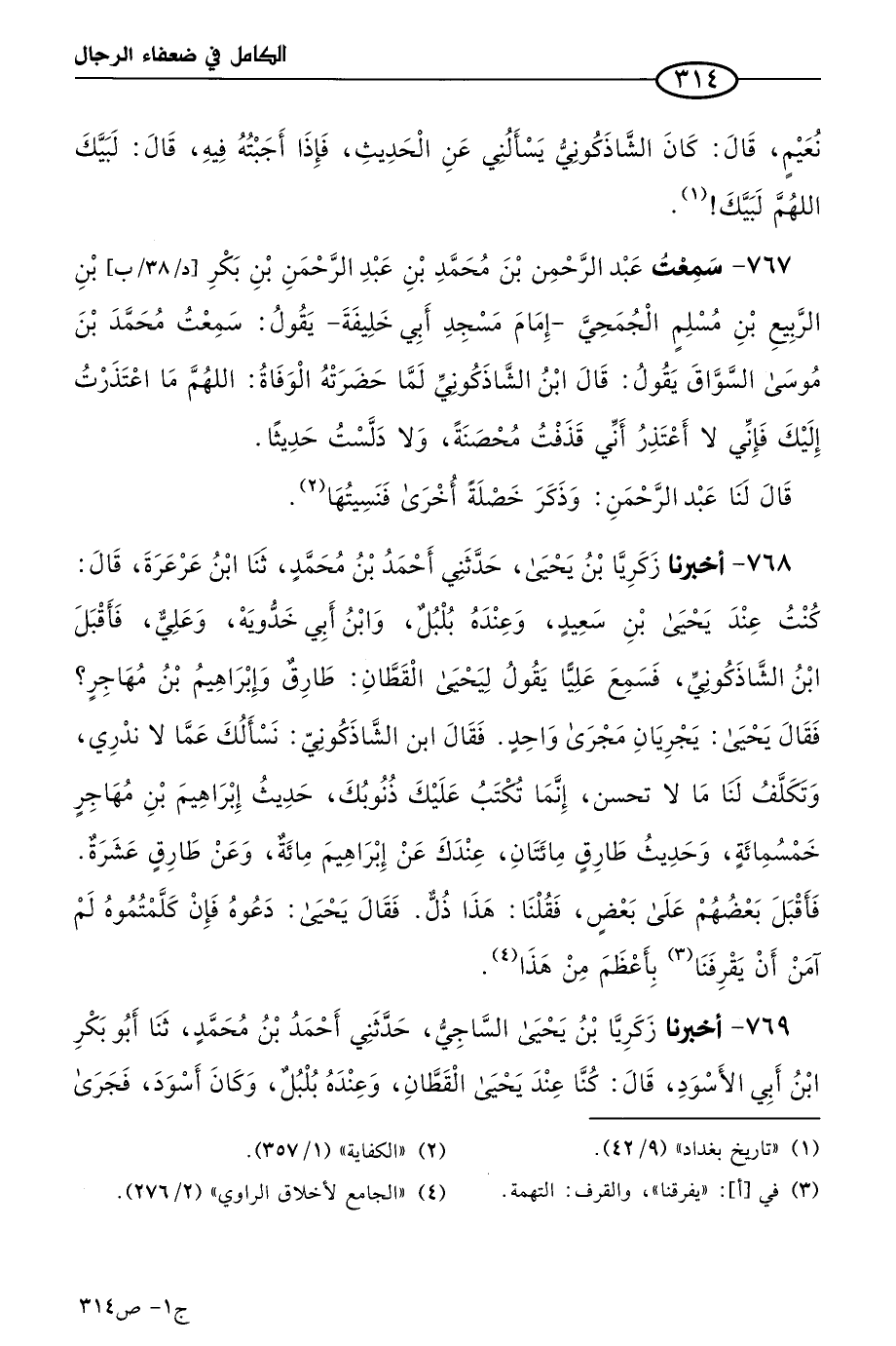 768 - أخبرنا زكريا بن يَحيى، حَدَّثني أحمد بن مُحمد، حَدثنا ابن عرعرة قال: كنتُ عند يَحيى بن سعيد وعنده بلبل، وابن أبي خدويه، وعلي، فأقبل ابن الشاذكوني فسمع عَليًا يقول ليحيى القطان: طارق وإبراهيم بن مهاجر؟ فقال يَحيى: يجريان مجرى واحد، فقال ابن الشاذكوني: نسألك عما لا تدري (1) وتكلف لنا ما لا تحسن، إنما تكتب عليك ذنوبك، حديث إبراهيم بن مهاجر خمس مِئَة وحديث طارق مائتان، عندك عن إبراهيم مائة وعن طارق عشرة، فأقبل بعضهم على بعض، فقلنا: هذا ذل، فقال يَحيى: دعوه فإن كلمتموه لم آمن أن يَقْرِفَنا بأعظم من هذا.