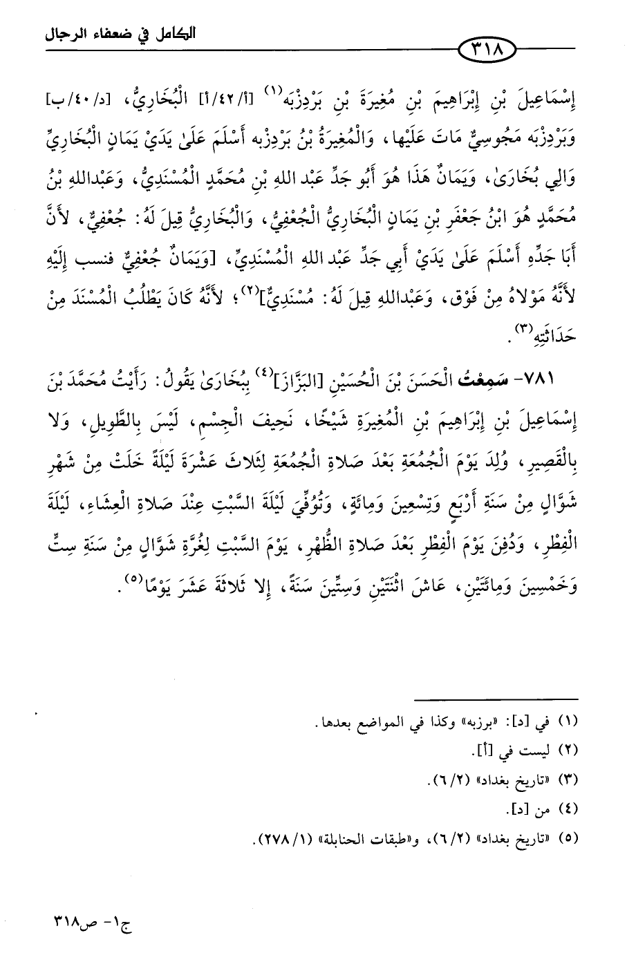 781 - سمعتُ الحسن بن الحسين البزاز ببخارى يقول: رأيت مُحمد بن إسماعيل بن إبراهيم بن المغيرة شيخا نحيف الجسم ليس بالطويل، ولا بالقصير، ولد يوم الجمعة بعد صلاة الجمعة لثلاث عشرة ليلة خلت من شهر شوال من سنة أربع وتسعين ومِئَة، وتوفي ليلة السبت عند صلاة العشاء ليلة الفطر ودفن يوم الفطر بعد صلاة الظهر يوم السبت لغرة شوال من سنة ست وخمسين ومِئَتَين، عاش اثنتين وستين سنة إلا ثلاثة عشر يومًا.