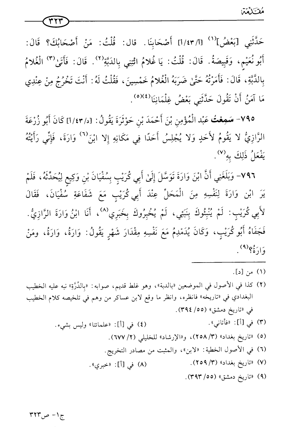 796 - وبلغني أن ابن وارة توسل إلى أبي كريب بسفيان بن وكيع ليحدثه فلم ير ابن وارة لنفسه من المحل عند أبي كريب مع شفاعة سفيان، فقال لأبي كريب: لم ينبئوك بنبئي، لم يخبروك بخبري، أنا ابن وارة الرازي، فجفاه أَبو كريب، وكان يدمدم مع نفسه مقدار شهر، يقول: وارة، وارة، ومَن وارة؟.
