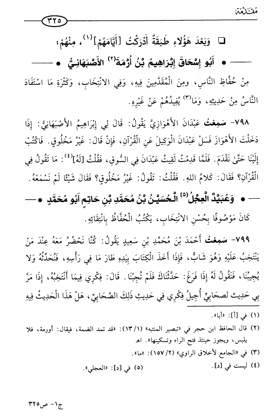 798 - سمعتُ عبدان الأهوازي يقول: قال لي إبراهيم الأصبهاني: إذا دخلت الأهواز فسل عبدان الوكيل عن القرآن، فإن قال غير مخلوق فاكتب إلينا حتى نقدم، فلما قدمت لقيت عبدان في السوق فقلت له: ما تقول في القرآن؟ فقال: كلام الله، فقلت: تقول غير مخلوق؟ فقال شيئا لم نسمعه.