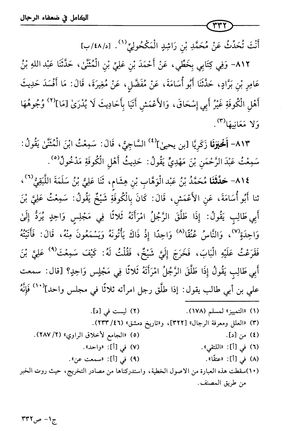 814 - حَدثنا مُحمد بن عَبد الوهاب بن هشام، حَدثنا علي بن سلمة اللبقي، حَدثنا أَبو أسامة، عن الأَعمَش، قال: كان بالكوفة شيخ يقول: سَمعتُ علي بن أبي طالب يقول: إذا طلق الرجل امرأته ثلاثا في مجلس واحد يرد إلى واحدة، والناس عنقا واحدا إذ ذاك يأتونه ويسمعون منه، قال: فأتيته فقرعت عليه الباب فخرج إلي شيخ، فقلت له: كيف سمعت علي بن أبي طالب يقول: إذا طلق الرجل امرأته ثلاثا في مجلس واحد؟ قال: سمعت علي بن أبي طالب يقول: إذا طلق رجل امرأته ثلاثا في مجلس واحد فإنه يُرد إلى واحد. قال: فقلت له: أَنَّى سمعت هذا من علي؟ قال: أُخرج إليك كتابي، فأخرج كتابه فإذا فيه: بسم الله الرحمن الرحيم، هذا ما سمعت علي بن أبي طالب يقول: إذا طلق الرجل امرأته ثلاثا في مجلس واحد فقد بانت منه، ولا تحل له حتى تنكح زوجا غيره. قال: قلتُ: ويحك هذا غير الذي تقول! قال: الصحيح هذا، ولكن هؤلاء أرادوني على ذلك.