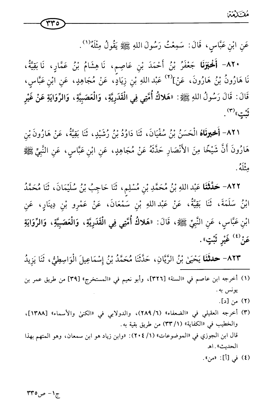 820 - أخبرنا جعفر بن أحمد بن عاصم، حَدثنا هشام بن عمار، حَدثنا بَقِيَة، حَدثنا هارون بن هارون، عن عَبد الله بن زياد، عن مجاهد، عن ابن عباس، قال: قال رسول الله صَلى الله عَليه وسَلم: هلاك أُمَّتِي في القدرية والعصبية والرواية عن غير ثبت.