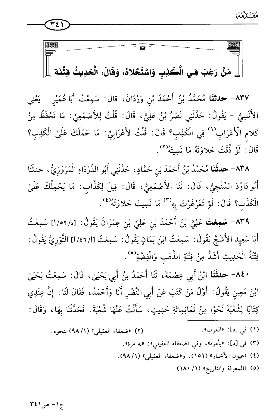 840 - حَدثنا ابن أبي عصمة، حَدثنا أحمد بن أبي يَحيى، قال: سمعتُ يَحيى بن مَعين يقول: أول من كتب عن أبي النضر أنا وأحمد، فقال لنا: إن عندي كتابا لشعبة نحوا من ثمانمِئَة حديث، سألت عنها شُعبَة فحدثنا بها، وقال: عندي غير هذه لست أجترئ عليها، ثم حضرناه بعد وقد أخرج تلك الأحاديث الباقية فكان يقول فيها: حَدثنا شُعبَة، والحديث فتنة، كانت نحوا من أربعة آلاف.