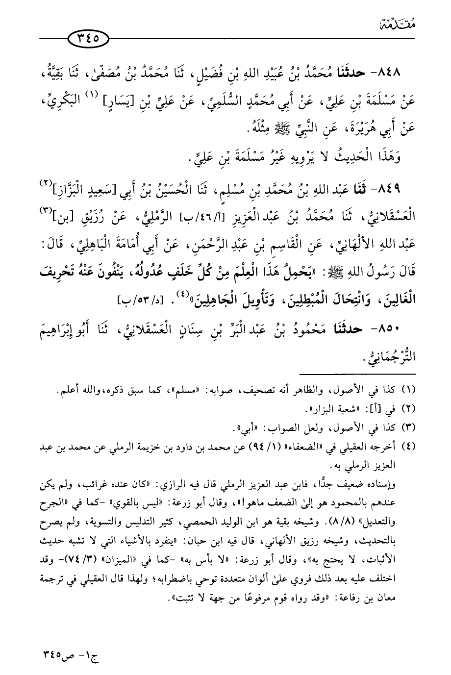 851 - وحدثنا أحمد بن مُحمد بن عَبد الكريم، حَدثنا الحسن بن عرفة، قالا: حَدثنا إسماعيل، يَعني ابن عياش، عن مُعَان بن رفاعة السلامي، عن إبراهيم بن عَبد الرحمن العذري، قال: قال رسول الله صَلى الله عَليه وسَلم: يحمل هذا العلم من كل خلف عدوله، ينفون عنه كذب الجاهلين وانتحال المبطلين وافتراء الغالين.