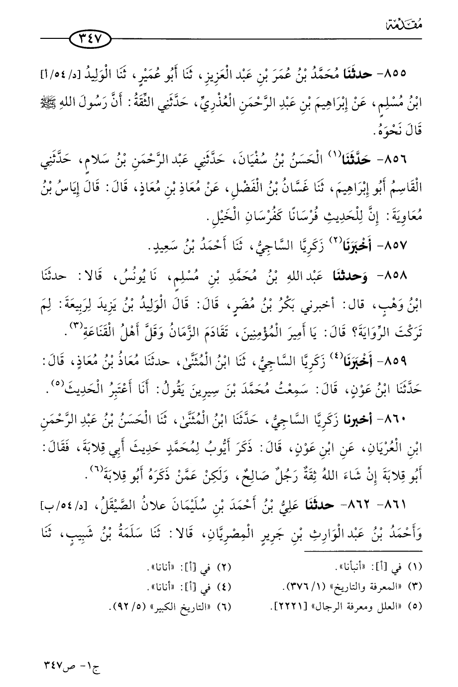 859 - أخبرنا زكريا الساجي، حَدثنا ابن المثنى، حَدثنا معاذ بن معاذ، قال: حَدثنا ابن عون، قال: سمعتُ مُحمد بن سِيرين يقول: أنا أعتبر الحديث.
