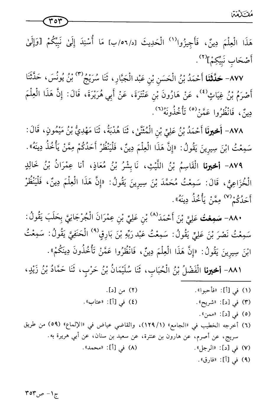 880 - سمعتُ علي بن أحمد بن علي بن عمران الجرجاني بحلب يقول: سَمعتُ نصر بن علي يقول: سَمعتُ عَبد رَبِّه بن بارق الحنفي يقول: سَمعتُ ابن سِيرين: يقول: إن هذا العلم دين، فانظروا عَمَّن تأخذون دينكم.