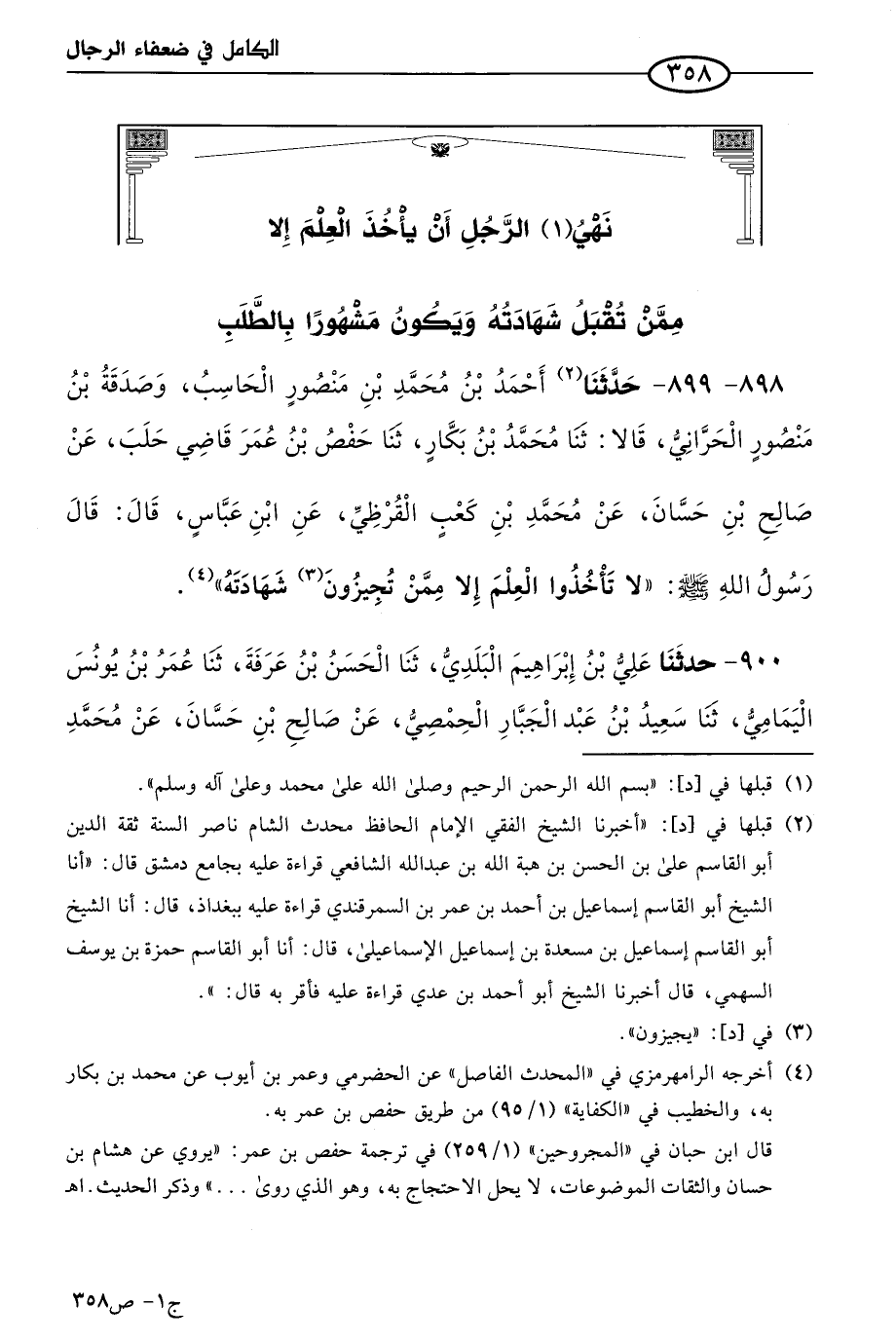 900 - حَدثنا علي بن إبراهيم البلدي، حَدثنا الحسن بن عرفة، حَدثنا عُمر بن يُونُس اليمامي، حَدثنا سعيد بن عَبد الجبار الحِمصِي، عن صالح بن حسان، عن مُحمد بن كعب، عن ابن عباس، عن النبي صَلى الله عَليه وسَلم؛ لا تأخذوا العلم إلا ممن تقبلون شهادته.