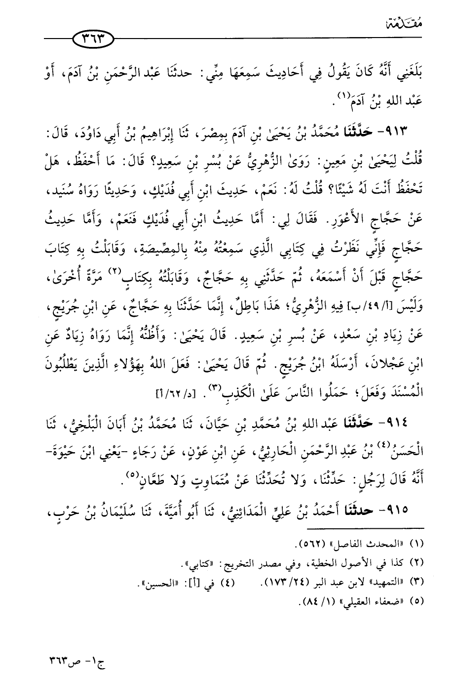 913 - حَدثنا مُحمد بن يَحيى بن آدم بمصر، حَدثنا إبراهيم بن أبي داود، قال: قلتُ ليحيى بن مَعين: رَوى الزُّهْري عن بسر بن سعيد؟ قال: مَا أحفظ، هل تحفظ أنت له شيئا؟ قلت له: نعم، حديث ابن أبي فديك، وحديثا رواه سُنَيد، عن حجاج الأعور، فقال لي: أما حديث ابن أبي فديك فنعم، وأما حديث حجاج فإني نظرت في كتابي الذي سمعته منه بالمصيصة، وقابلت به كتاب حجاج قبل أن أسمعه ثم حَدَّثني به حجاج، وقابلته بكاتبٍ مرة أخرى وليس فيه الزُّهْري، هذا باطل، إنما حَدثنا به حجاج عن ابن جُرَيج، عن زياد بن سعد، عن بُسر بن سعيد، قال يَحيى: وأظنه إنما رواه زياد عن ابن عجلان، أرسله ابن جُرَيج، ثم قال يَحيى: فعل الله بهؤلاء الذين يطلبون المسند وفعل، حملوا الناس على الكذب.