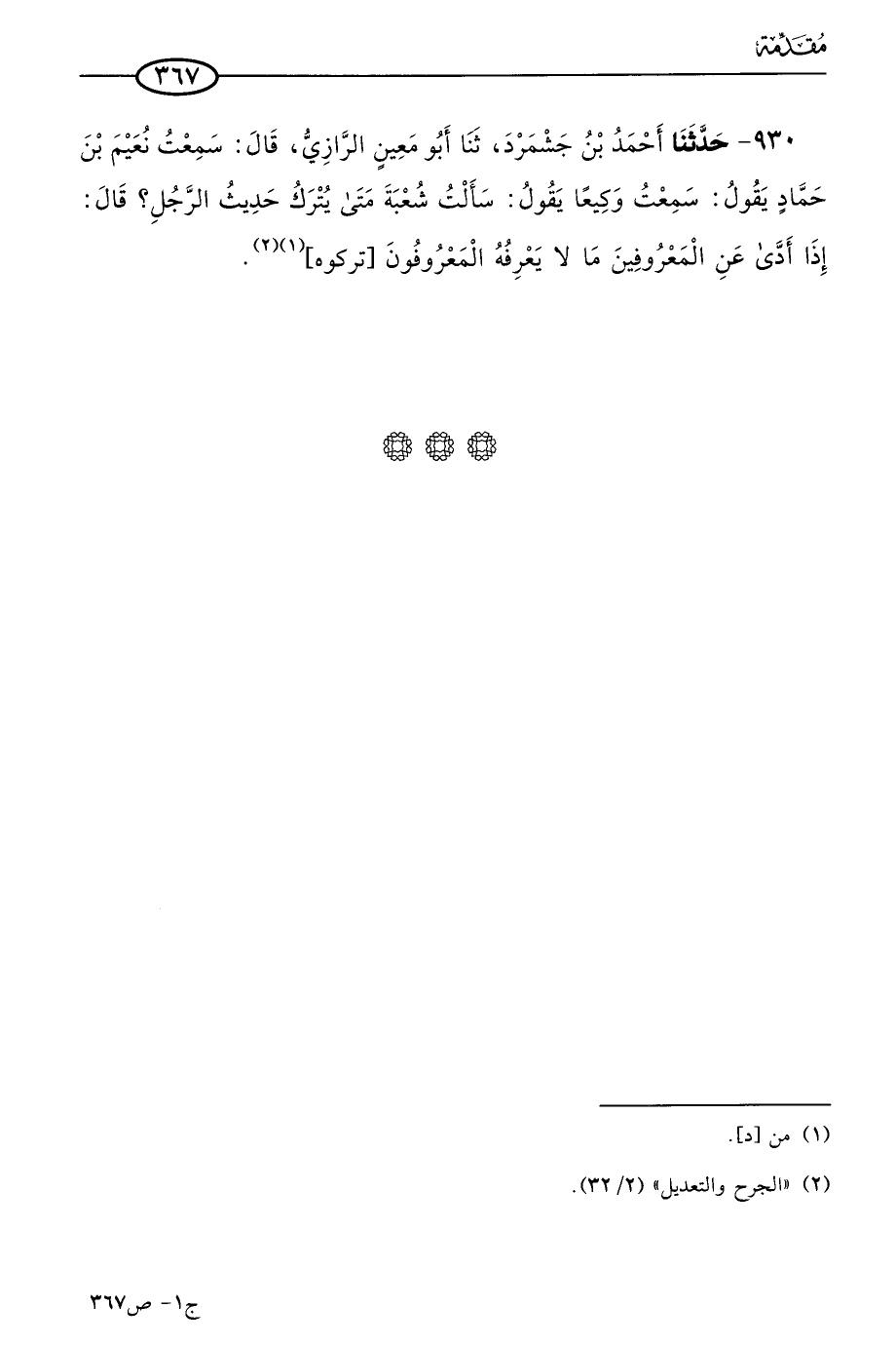 930 - حَدثنا أحمد بن جشمرد، حَدثنا أَبو مَعين الرازي، قال: سمعتُ نعيم بن حماد يقول: سَمعتُ وكيعا يقولُ: سَألتُ شُعبَة: متى يُترَك حديث الرجل؟ قال: إذا أدى عن المعروفين ما لا يعرفه المعروفون، تركوه.
