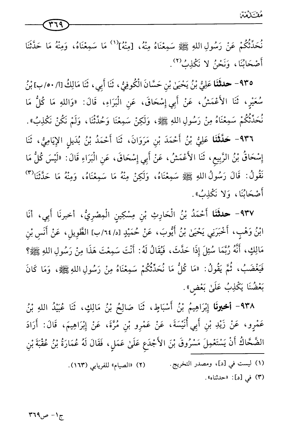 935 - حَدثنا علي بن يَحيى بن حسان الكوفي، حَدثنا أبي، حَدثنا مالك بن سعير، حَدثنا الأَعمَش، عن أبي إسحاق، عن البراء قال: والله ما كل ما نحدثكم سمعناه من رسول الله صَلى الله عَليه وسَلم، ولكن سمعنا وحُدِّثْنَا، ولم نكن نكذب.