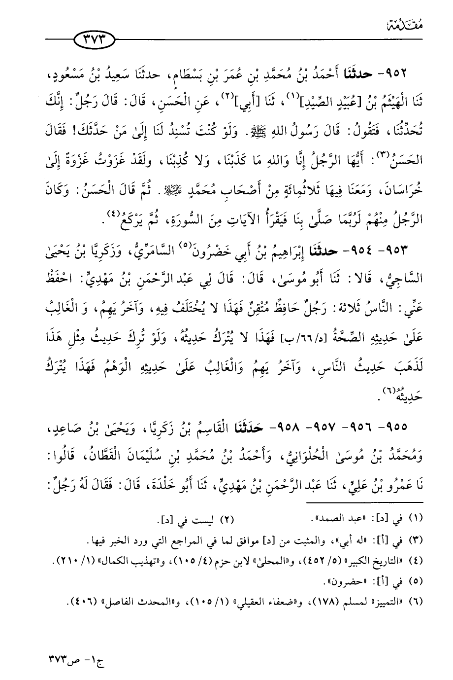 953 - 954 - حَدثنا إبراهيم بن أبي خضرون السامري، وزكريا بن يَحيى الساجي، قالا: حَدثنا أَبو موسى، قال: قال لي عَبد الرحمن بن مهدي: احفظ عني، الناس ثلاثة: رجل حافظ متقن فهذا لا يُخْتَلَف فيه، وآخر يهم والغالب على حديثه الصحة فهذا لا يُتْرَك حديثه، ولو تُرِك حديث مثل هذا لذهب حديث الناس، وآخر يهم والغالب على حديثه الوهم فهذا يُتْرَك حديثه.