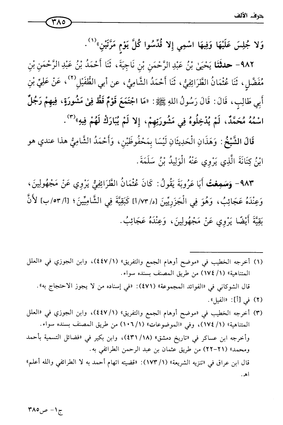 983 - وسمعت أبا عَرُوبة يقول: كان عثمان الطرائفي يروي عن مجهولين وعنده عجائب، وهو في الجزريين كبقية في الشاميين، لأن بقية أَيضًا يروي عن مجهولين وعنده عجائب.