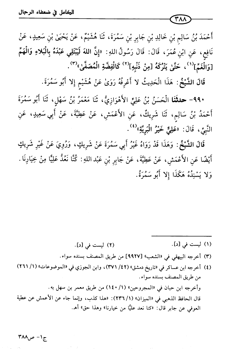 990 - حَدثنا الحسن بن علي الأهوازي، حَدثنا معمر بن سهل، حَدثنا أَبو سمرة أحمد بن سالم، حَدثنا شريك، عن الأَعمَش، عن عطية، عن أبي سعيد، عن النبي صَلى الله عَليه وسَلم قال: عليٌ خير البرية.