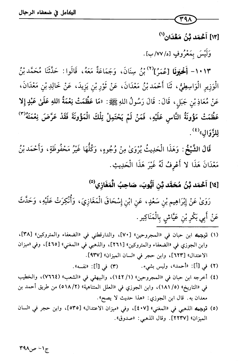 قال الشيخ: وهذا الحديث يُرْوَى من وجوه، وكلها غير محفوظة، وأحمد بن معدان هذا لا أَعرفُ له غير هذا الحديث.