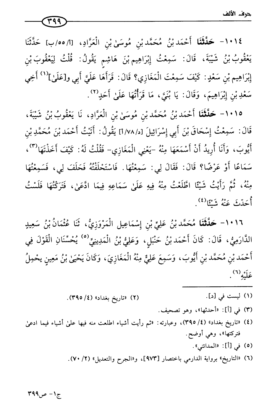 1014 - حَدثنا أحمد بن مُحمد بن موسى بن العراد، حَدثنا يعقوب بن شيبة، قال: سمعتُ إبراهيم بن هاشم يقول: قلت ليعقوب بن إبراهيم بن سعد: كيف سمعت المغازي؟ قال: قرأها علي أبي، وعلى أخي سعد بن إبراهيم، وقال: يا بني ما قرأتها على أحد.