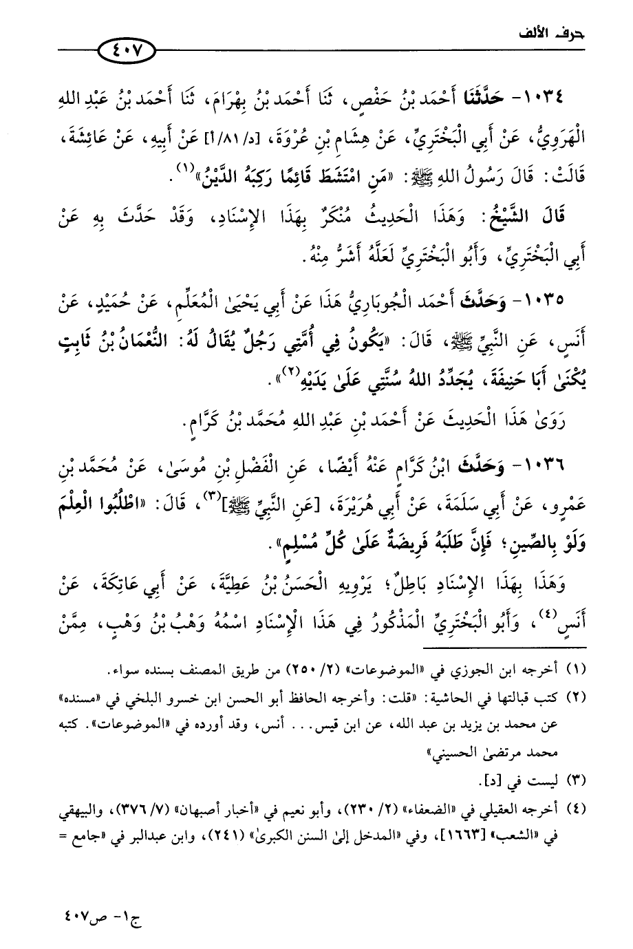 1035 - وحدث أحمد الجوباري هذا، عن أبي يَحيى المعلم، عن حميد، عن أَنَس، عن النبي صَلى الله عَليه وسَلم قال: يكون في أُمَّتِي رجل يُقال له: النعمان بن ثابت، يُكْنَى أبا حنيفة، يجدد الله سنتي على يديه.