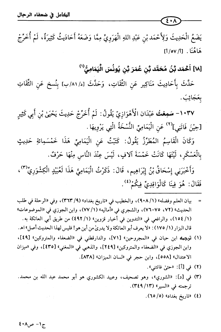 1037 - سمعت عبدان الأهوازي يقول: لم أخرج حديث يَحيى بن أبي كثير حين فاتني عن اليمامي النسخة التي يرويها.