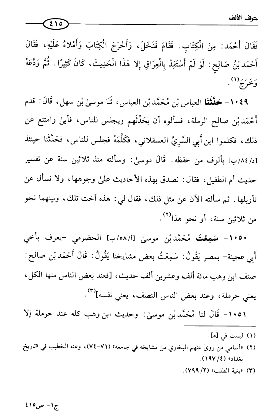1050 - سمعت مُحمد بن موسى الحضرمي، يعرف بأخي أبي عجينة بمصر، يقول: سَمعتُ بعض مشايخنا يقول: قال أحمد بن صالح: صنف ابن وهب مِئَة ألف وعشرين ألف حديث، فعند بعض الناس منها الكل، يعني حرملة، وعند بعض الناس النصف، يعني نفسه.