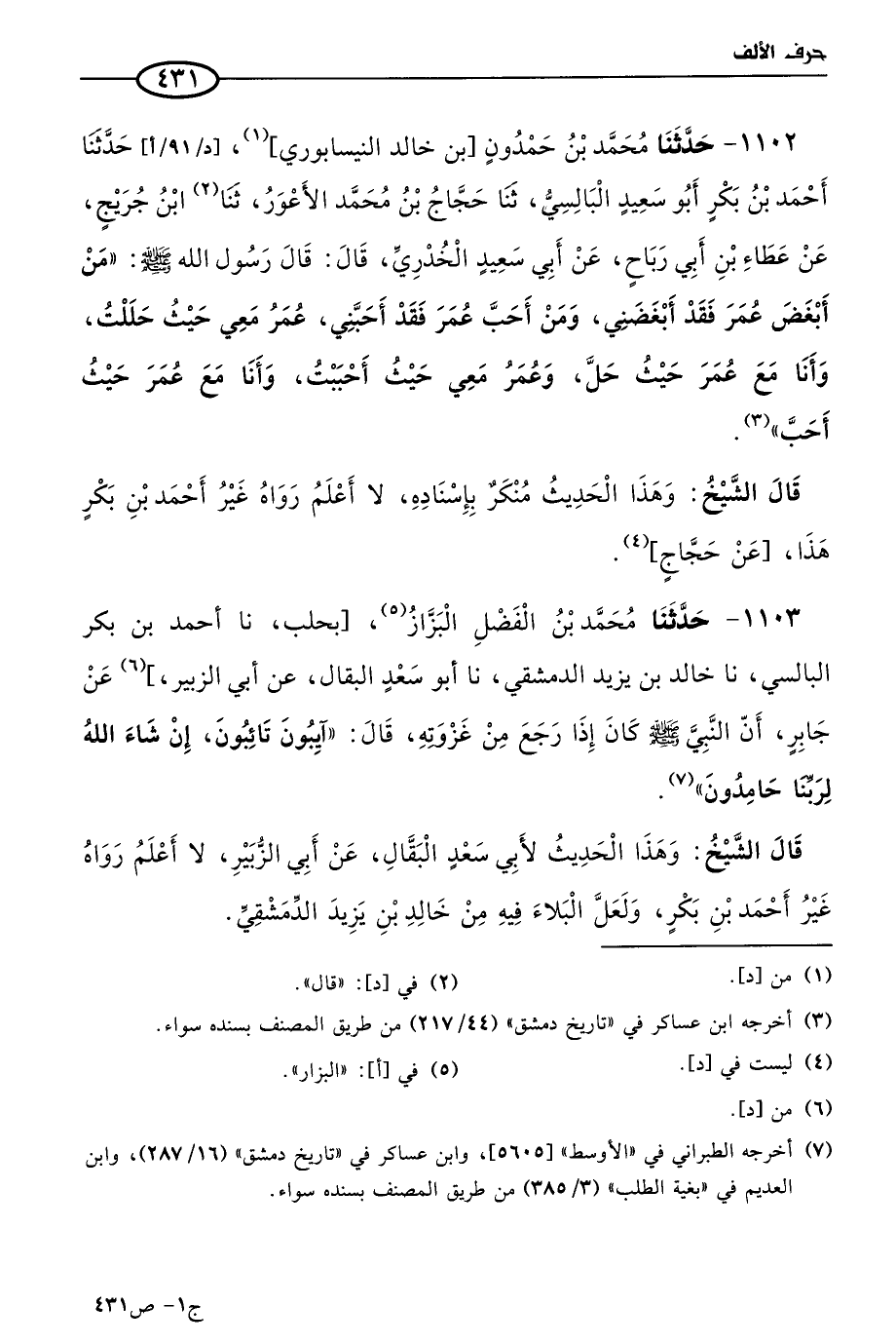 1102 - حَدثنا مُحمد بن حمدون بن خالد النيسابوري، حَدثنا أحمد بن بكر أَبو سعيد البالسي، حَدثنا حجاج بن مُحمد الأعور، حَدثنا ابن جُرَيج، عن عطاء بن أبي رباح، عن أبي سعيد الخدري، قال: قال رسول الله صَلى الله عَليه وسَلم: مَن أبغض عُمر فقد أبغضني، ومن أحب عُمر فقد أحبني، عُمر معي حيث حللت، وأنا مع عُمر حيث حل، وعُمر معي حيث أحببت، وأنا مع عُمر حيث أحب.