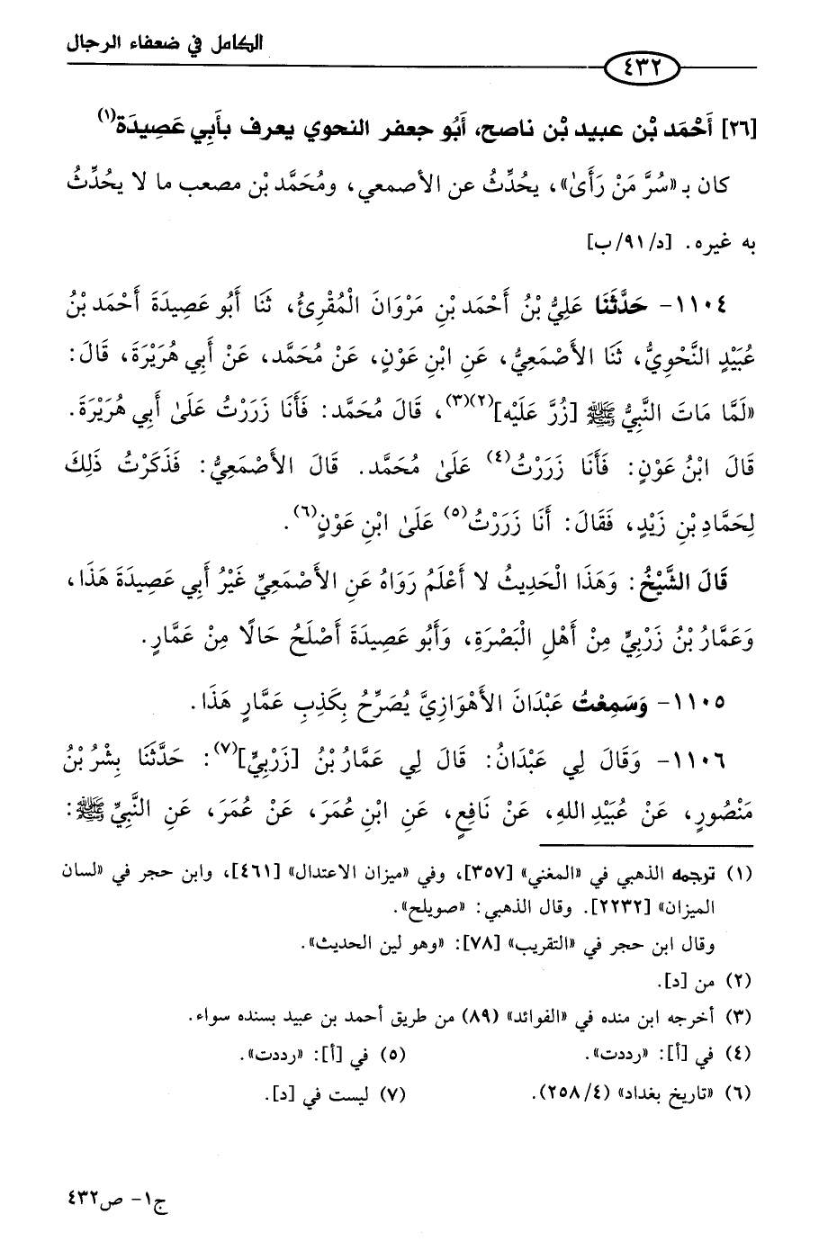 قال الشيخ: وهذا الحديث لا أعلم رواه عن الأصمعي غير أبي عصيدة هذا، وعمار بن زربي من أهل البصرة، وأَبو عصيدة أصلح حالا من عمار، وسمعت.