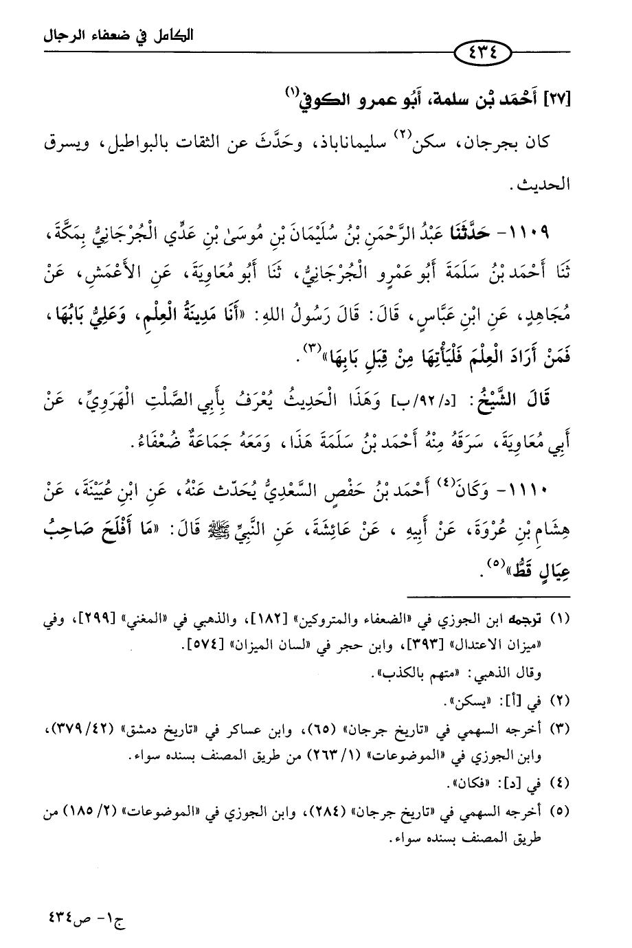 1109 - حَدثنا عَبد الرحمن بن سليمان بن موسى بن عدي الجرجاني بمكة، حَدثنا أحمد بن سلمة أَبو عَمرو الجرجاني، حَدثنا أَبو معاوية، عن الأَعمَش، عن مجاهد، عن ابن عباس، قال: قال رسول الله صَلى الله عَليه وسَلم: أنا مدينة العلم وعليٌّ بابها، فمن أراد العلم فليأتها من قِبَل بابها.
