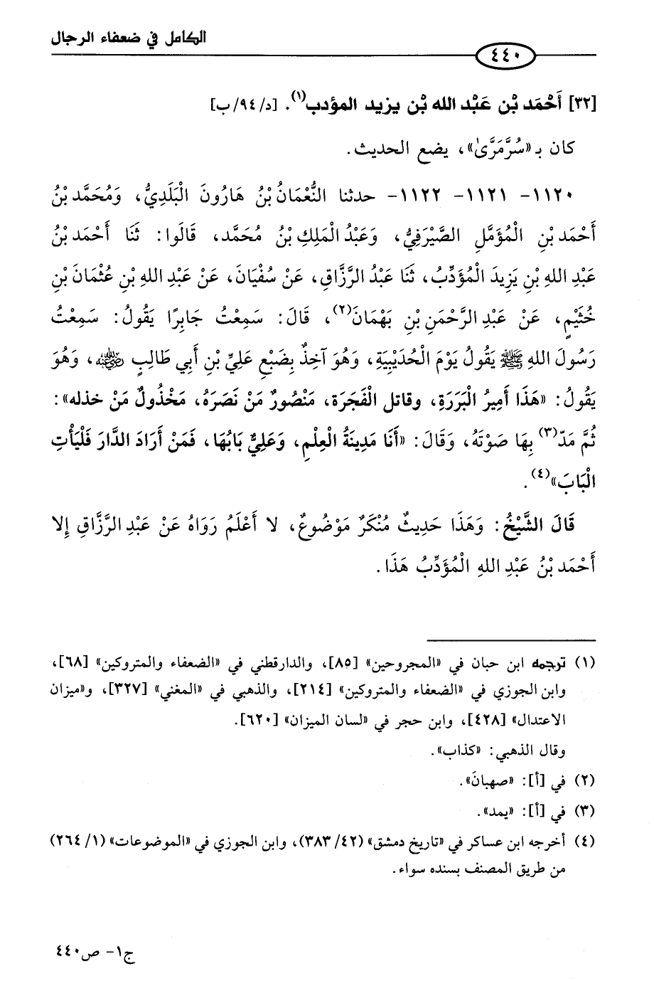 1120 - 1121 - 1122 - حَدثنا النعمان بن هارون البلدي، ومُحمد بن أحمد بن المؤمل الصيرفي، وعَبد الملك بن مُحمد، قالوا: حَدثنا أحمد بن عَبد الله بن يزيد المؤدب، حَدثنا عَبد الرَّزَّاق، عن سُفيان، عن عَبد الله بن عثمان بن خثيم، عن عَبد الرحمن بن بهمان، قال: سمعتُ جابرا يقول: سَمعتُ رسول الله صَلى الله عَليه وسَلم يقول يوم الحديبية، وهو آخذ بضبع علي بن أبي طالب رضي الله عنه، وهو يقول: هذا أمير البررة، وقاتل الفجرة، منصور مَن نصره، مخذول من خذله، ثم مد بها صوته، وقال: أنا مدينة العلم وعلي بابها، فمن أراد الدار فليأت الباب.