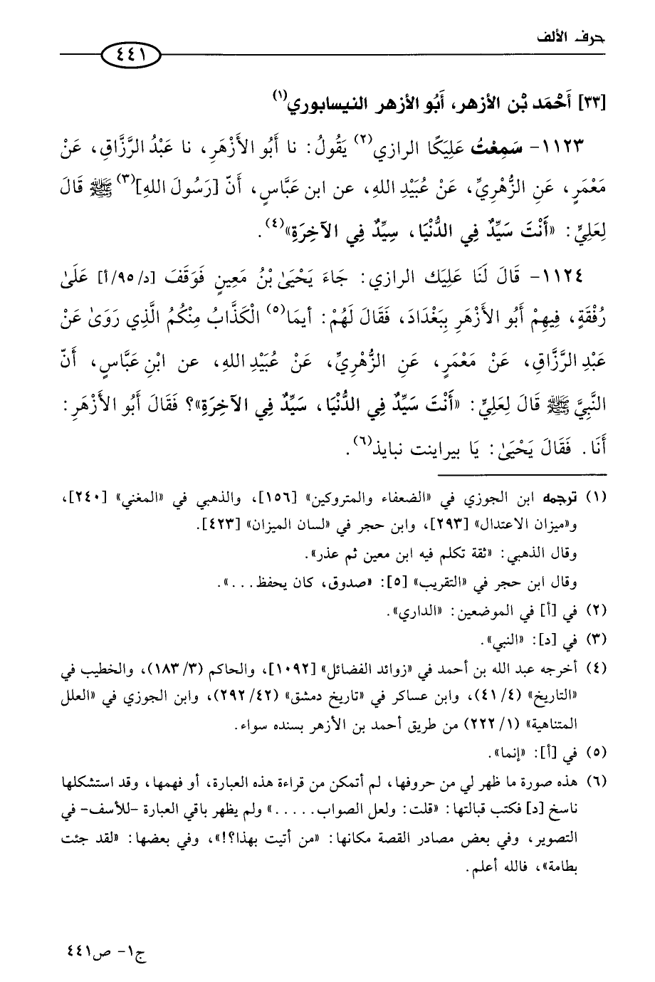 1123 - سمعت عليكا الرازي يقول: حَدثنا أَبو الأَزْهَر, حَدثنا عبد الرَّزَّاق, عن مَعمَر, عن الزُّهْري, عن عبيد الله، عن ابن عباس, أَنّ رسول الله صَلى الله عَليه وسَلم قال لِعلي: أنت سَيدٌ فِي الدُّنْيَا، سَيدٌ فِي الآخِرَةِ.