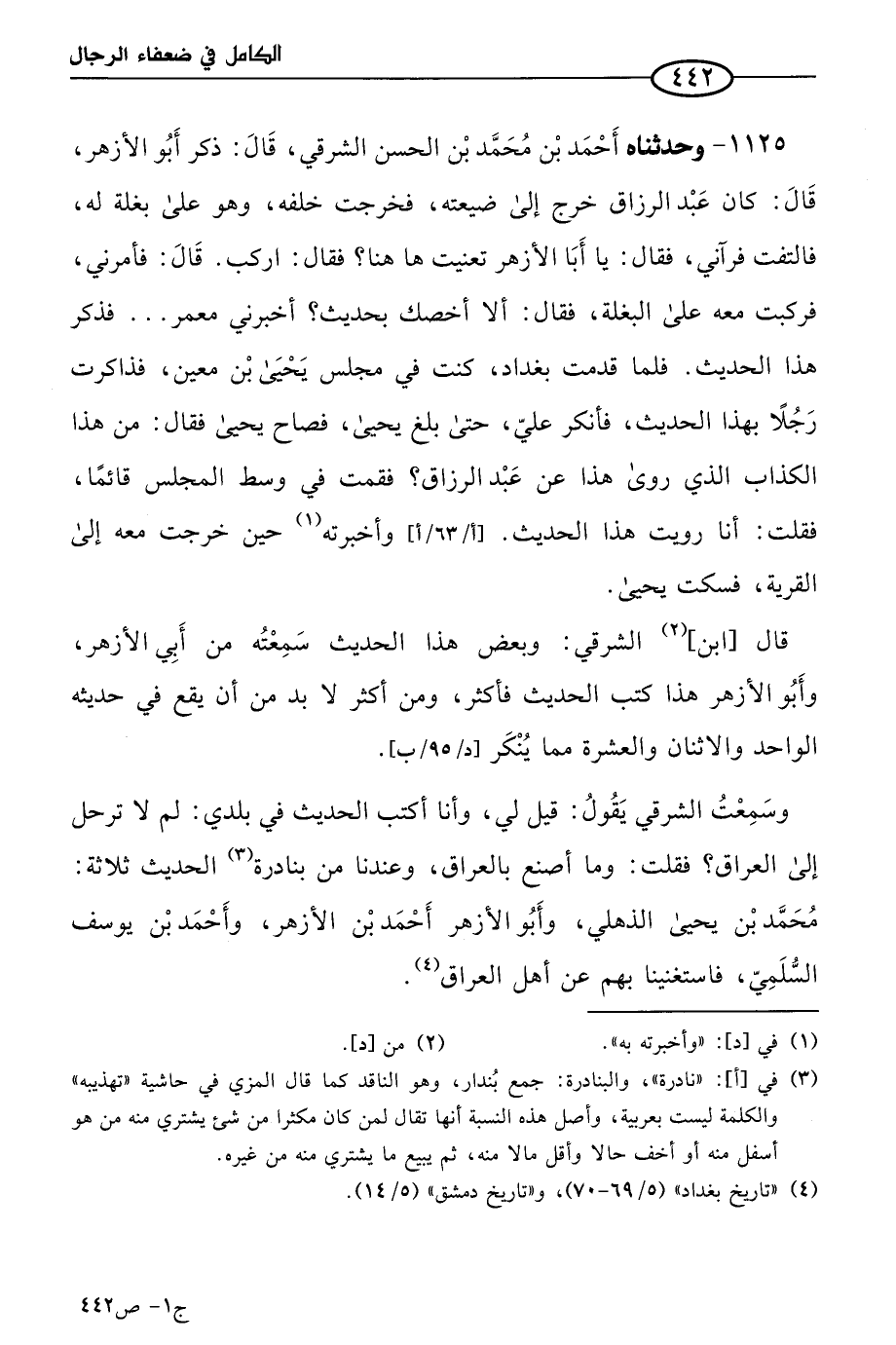 1125 - وحَدثناه أحمد بن مُحمد بن الحسن الشرقي، قال: ذكر أَبو الأَزْهَر, قال: كان عبد الرَّزَّاق خرج إلى ضيعته, فخرجت خلفه, وهو على بغلة له, فالتفت فرآني, فقال: يا أبا الأَزْهَر, تَعَنَّيت ها هُنا؟ فقال: اركب, قال: فأمرني فركبتُ معه على البغلة, فقال: ألا أخصك بحديث؟ أخبرني مَعمَر، فذكر هذا الحديث.