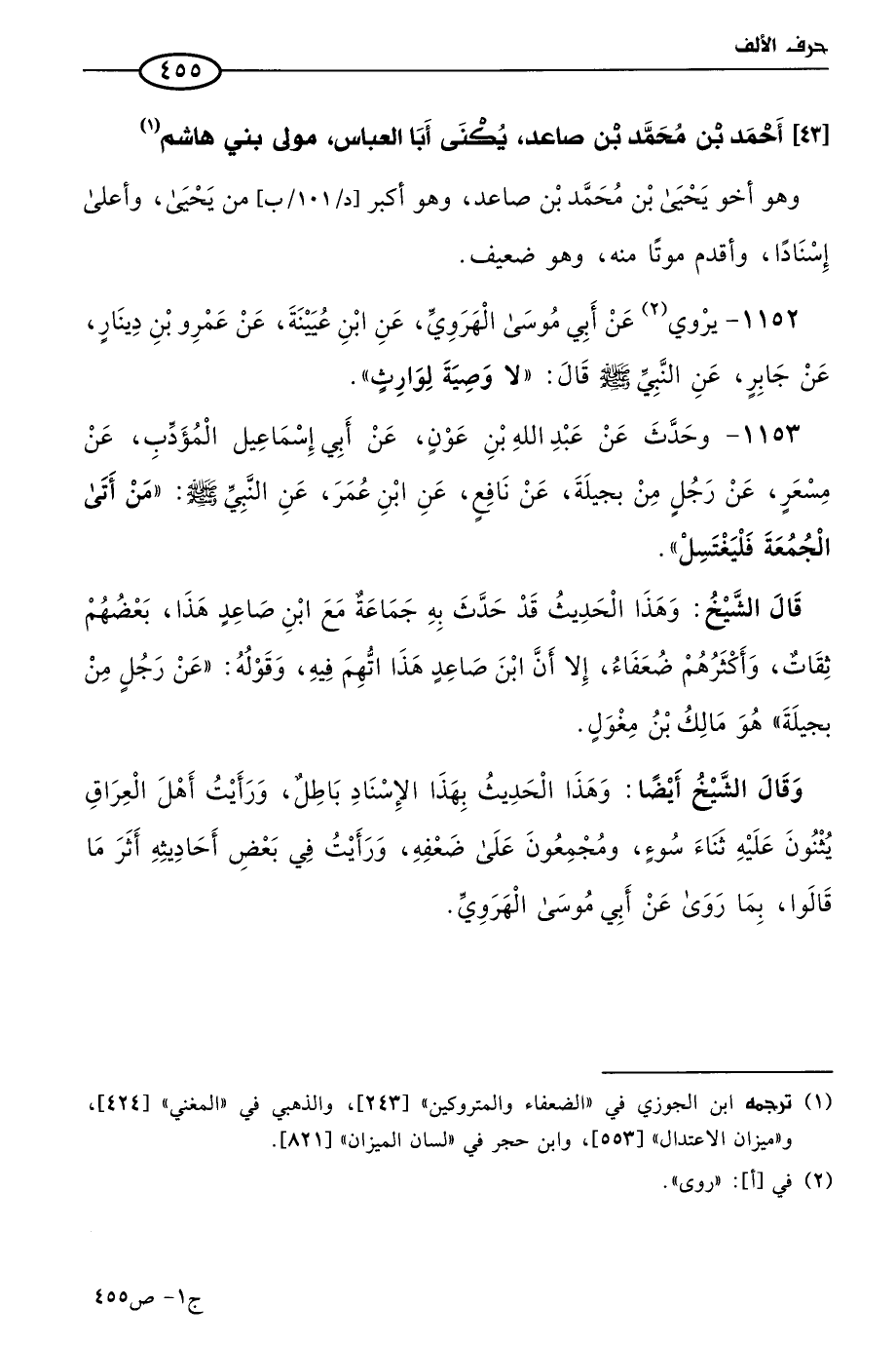 1152 - يروي عن أبي موسى الهروي، عن ابن عُيَينة، عن عَمرو بن دينار، عن جابر، عن النبي صَلى الله عَليه وسَلم قال: لا وصية لوارث.
