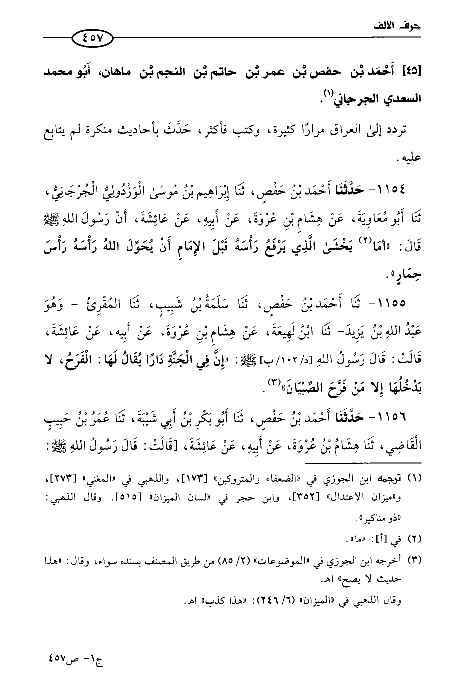 1154 - حَدثنا أحمد بن حفص، حَدثنا إبراهيم بن موسى الوزدولي الجرجاني، حَدثنا أَبو معاوية، عن هشام بن عروة، عن أبيه، عن عائشة، أَن رسُول الله صَلى الله عَليه وسَلم قال: أما يخشى الذي يرفع رأسه قبل الإمام أن يحول الله رأسه رأس حمار؟.