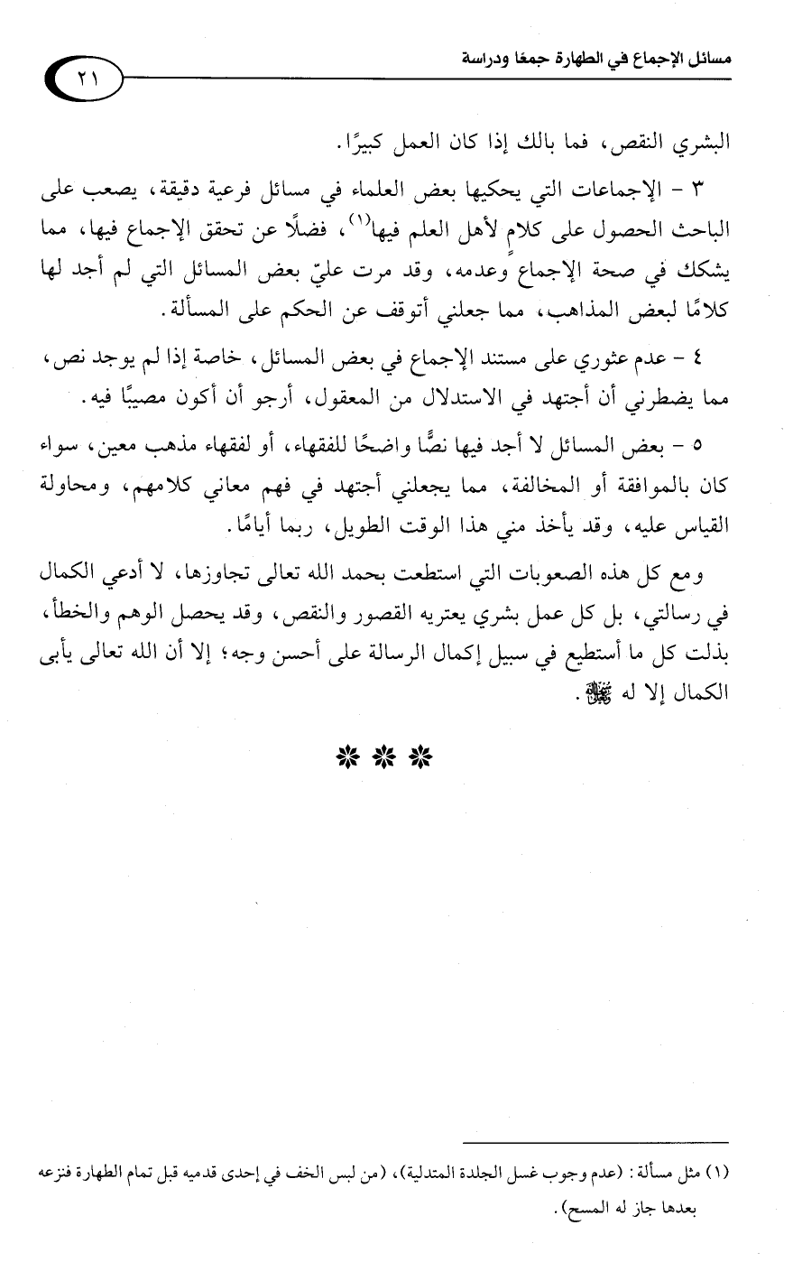 4 - عدم عثوري على مستند الإجماع في بعض المسائل، خاصة إذا لم يوجد نص، مما يضطرني أن أجتهد في الاستدلال من المعقول، أرجو أن أكون مصيبًا فيه.