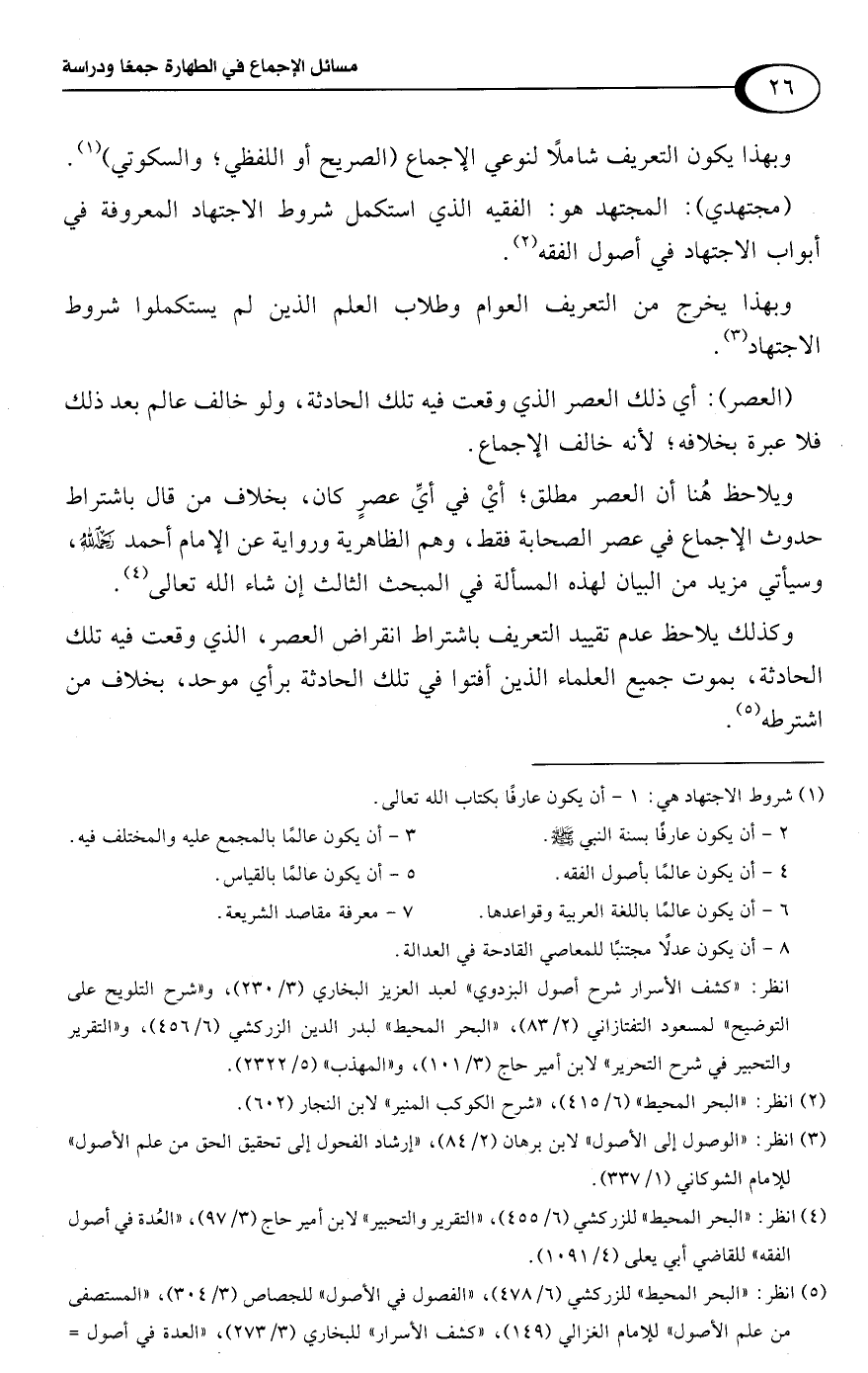 وكذلك يلاحظ عدم تقييد التعريف باشتراط انقراض العصر، الذي وقعت فيه تلك الحادثة، بموت جميع العلماء الذين أفتوا في تلك الحادثة برأي موحد، بخلاف من اشترطه (¬5).
