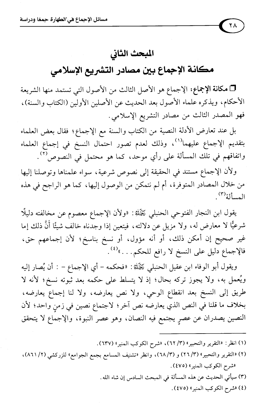• مكانة الإجماع: الإجماع هو الأصل الثالث من الأصول التي تستمد منها الشريعة الأحكام، ويذكره علماء الأصول بعد الحديث عن الأصلين الأولين (الكتاب والسنة)، فهو المصدر الثالث من مصادر التشريع الإِسلامي.