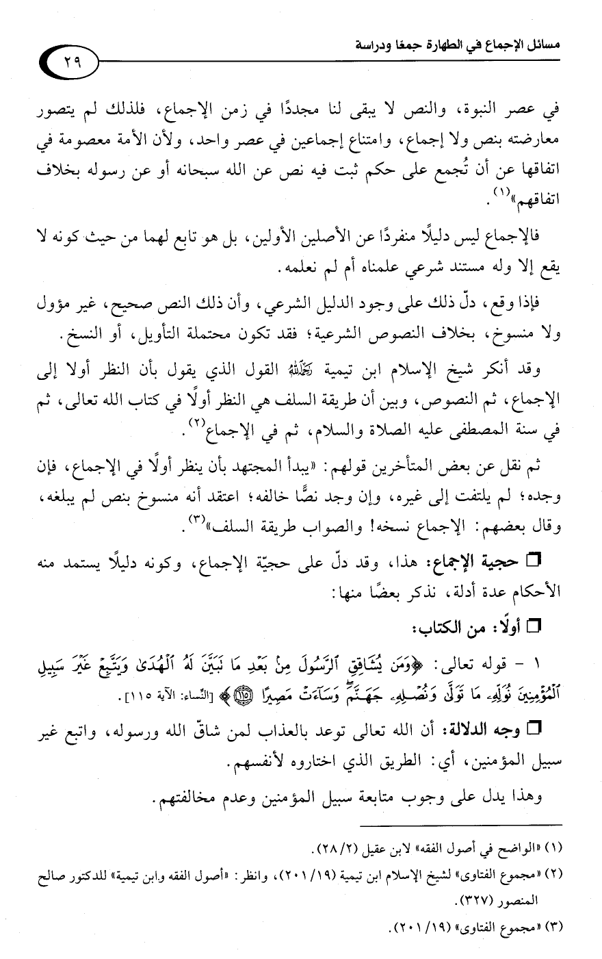 وقد أنكر شيخ الإسلام ابن تيمية رحمه اللَّه القول الذي يقول بأن النظر أولا إلى الإجماع، ثم النصوص، وبين أن طريقة السلف هي النظر أولًا في كتاب اللَّه تعالى، ثم في سنة المصطفى عليه الصلاة والسلام، ثم في الإجماع (¬2).