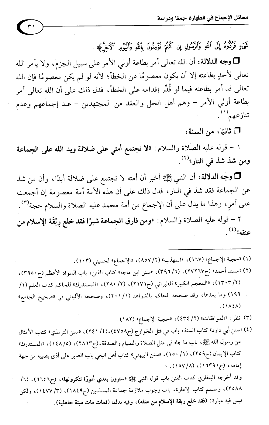 1 - قوله عليه الصلاة والسلام: "لا تجتمع أمتي على ضلالة ويد اللَّه على الجماعة ومن شذ شذ في النار" (¬2).