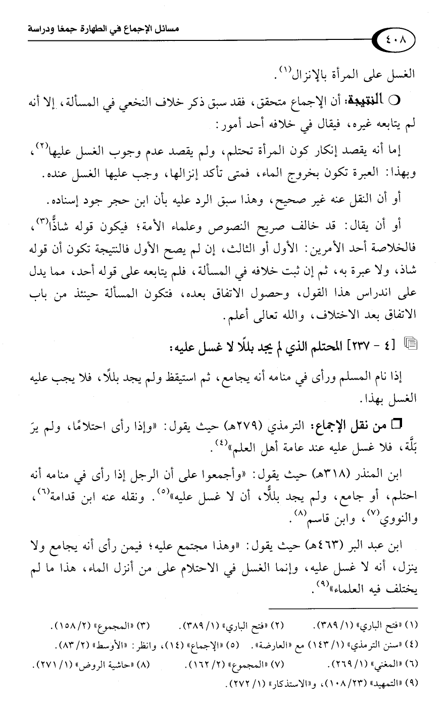 ابن عبد البر (463 هـ) حيث يقول: "وهذا مجتمع عليه؛ فيمن رأى أنه يجامع ولا ينزل، أنه لا غسل عليه، وإنما الغسل في الاحتلام على من أنزل الماء، هذا ما لم يختلف فيه العلماء" (¬9).