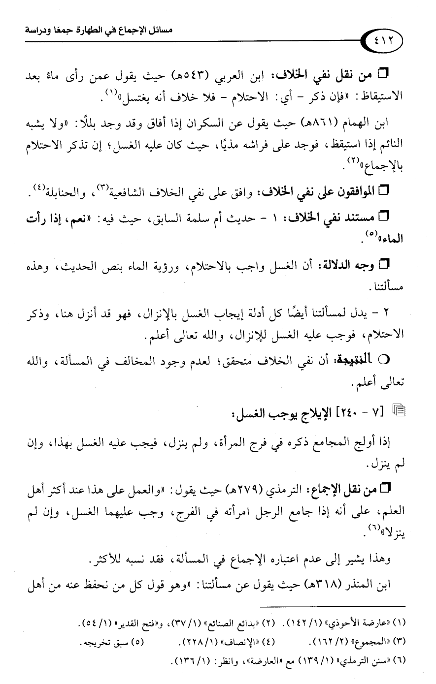 • من نقل نفي الخلاف: ابن العربي (543 هـ) حيث يقول عمن رأى ماءً بعد الاستيقاظ: "فإن ذكر -أي: الاحتلام- فلا خلاف أنه يغتسل" (¬1).