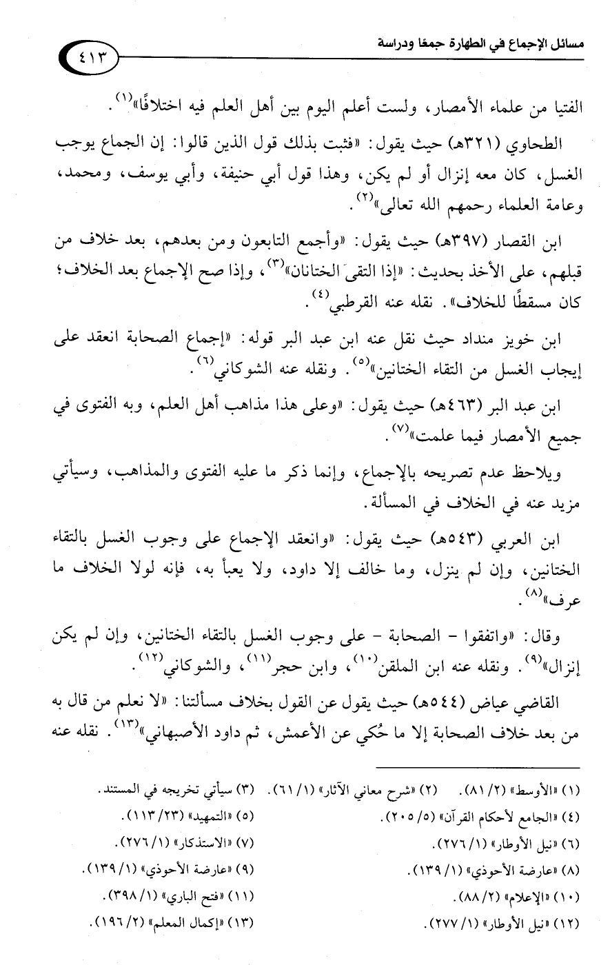 ابن العربي (543 هـ) حيث يقول: "وانعقد الإجماع على وجوب الغسل بالتقاء الختانين، وإن لم ينزل، وما خالف إلا داود، ولا يعبأ به، فإنه لولا الخلاف ما عرف" (¬8).