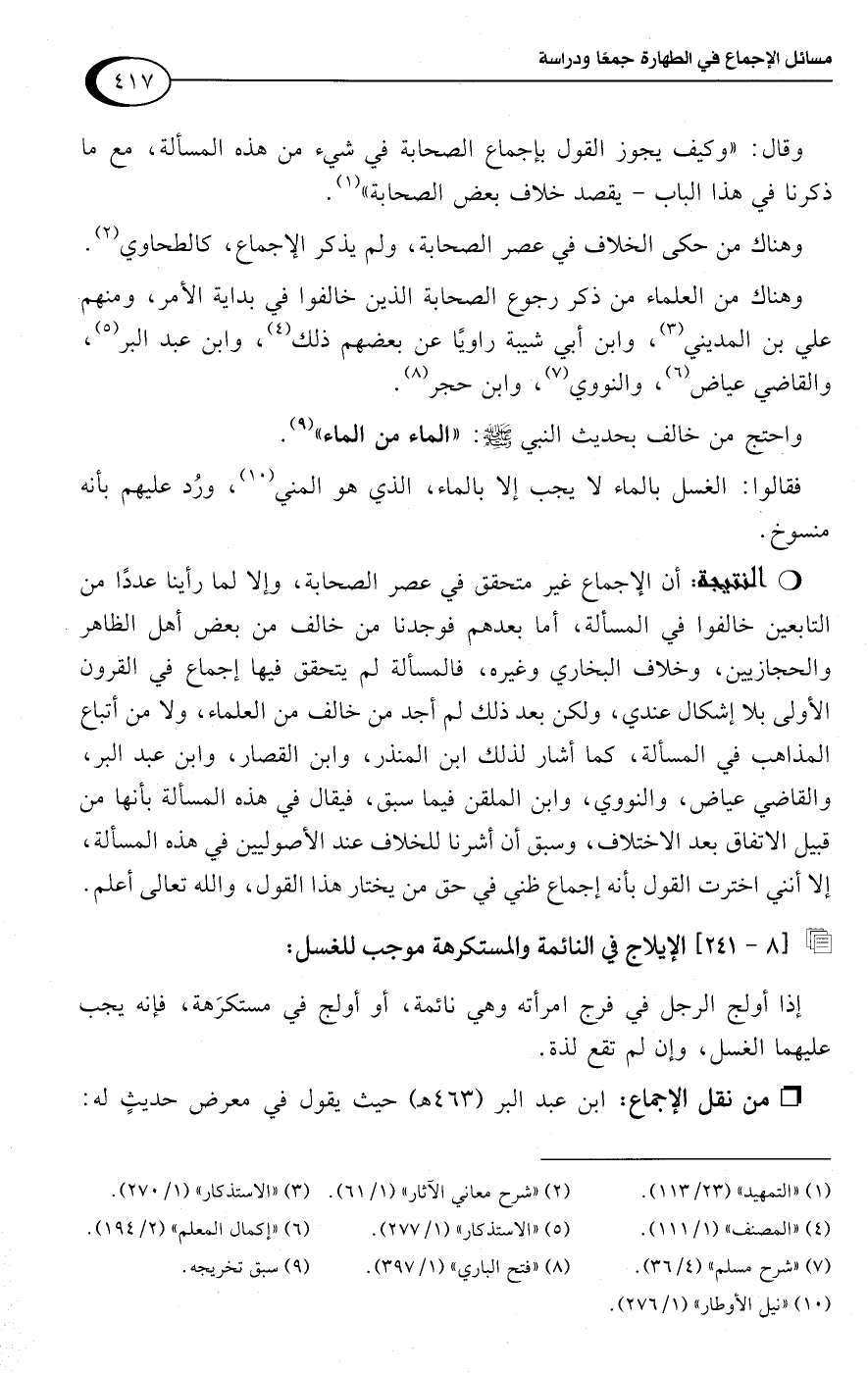 فقالوا: الغسل بالماء لا يجب إلا بالماء، الذي هو المني (¬10)، ورُد عليهم بأنه منسوخ.Rأن الإجماع غير متحقق في عصر الصحابة، وإلا لما رأينا عددًا من التابعين خالفوا في المسألة، أما بعدهم فوجدنا من خالف من بعض أهل الظاهر والحجازيين، وخلاف البخاري وغيره، فالمسألة لم يتحقق فيها إجماع في القرون الأولى بلا إشكال عندي، ولكن بعد ذلك لم أجد من خالف من العلماء، ولا من أتباع المذاهب في المسألة، كما أشار لذلك ابن المنذر، وابن القصار، وابن عبد البر، والقاضي عياض، والنووي، وابن الملقن فيما سبق، فيقال في هذه المسألة بأنها من قبيل الاتفاق بعد الاختلاف، وسبق أن أشرنا للخلاف عند الأصوليين في هذه المسألة، إلا أنني اخترت القول بأنه إجماع ظني في حق من يختار هذا القول، واللَّه تعالى أعلم.