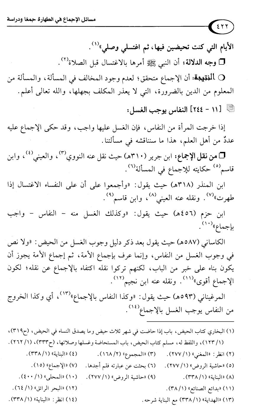 ابن حزم (456 هـ) حيث يقول: "وكذلك الغسل منه -النفاس- واجب بإجماع" (¬10).