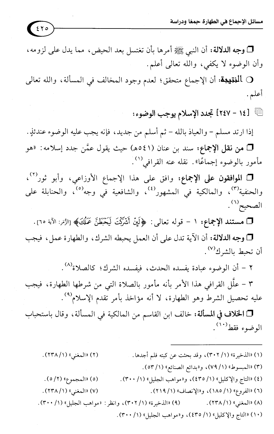 3 - علَّل القرافي هذا الأمر بأنه مأمور بالصلاة التي من شرطها الطهارة، فيجب عليه تحصيل الشرط وهو الطهارة، لا أنه مؤاخذ بأمر تقدم الإسلام (¬9).