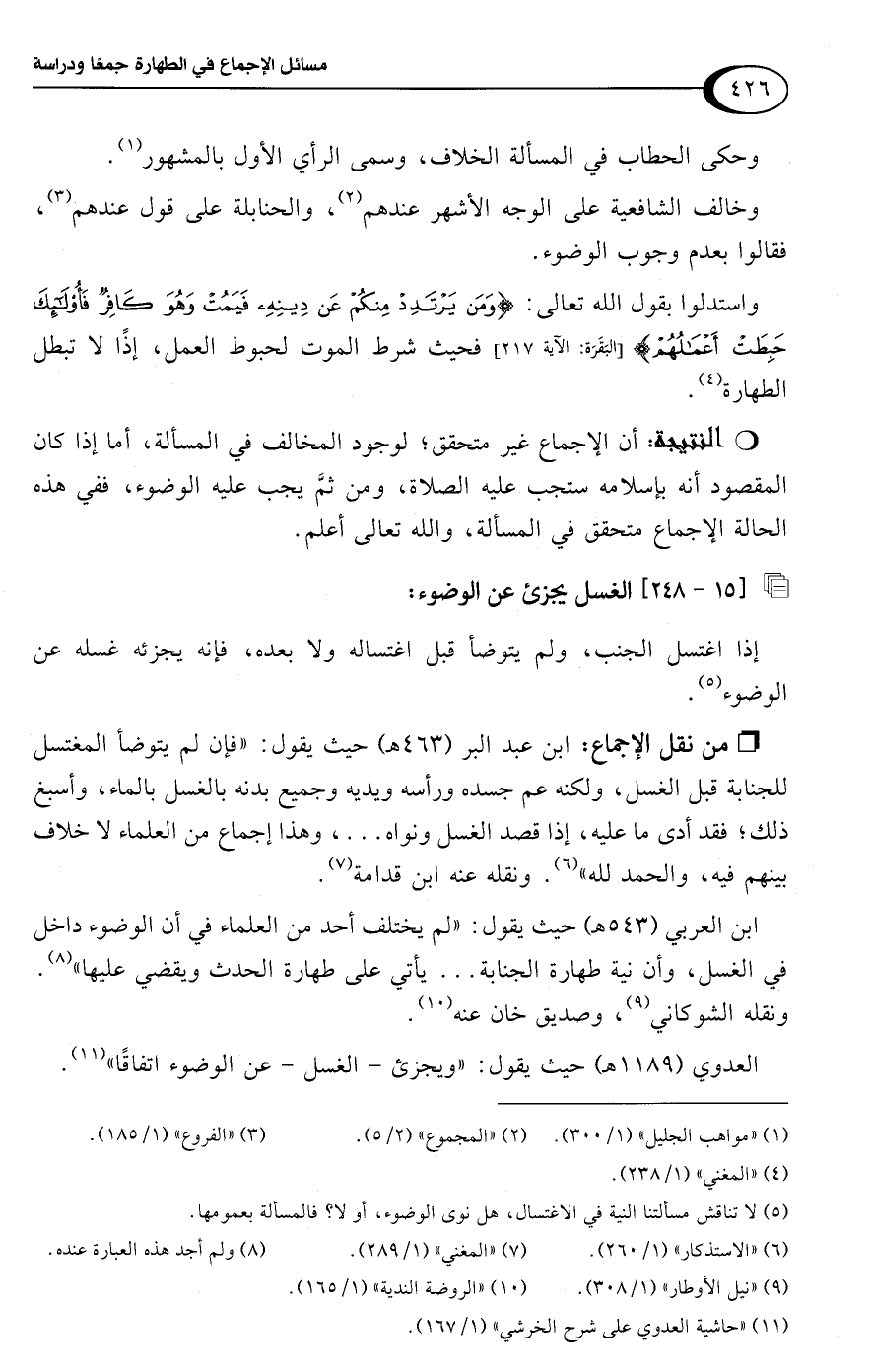واستدلوا بقول اللَّه تعالى: {وَمَنْ يَرْتَدِدْ مِنْكُمْ عَنْ دِينِهِ فَيَمُتْ وَهُوَ كَافِرٌ فَأُولَئِكَ حَبِطَتْ أَعْمَالُهُمْ} [البقرة: 217] فحيث شرط الموت لحبوط العمل، إذًا لا تبطل الطهارة (¬4).Rأن الإجماع غير متحقق؛ لوجود المخالف في المسألة، أما إذا كان المقصود أنه بإسلامه ستجب عليه الصلاة، ومن ثم يجب عليه الوضوء، ففي هذه الحالة الإجماع متحقق في المسألة، واللَّه تعالى أعلم.