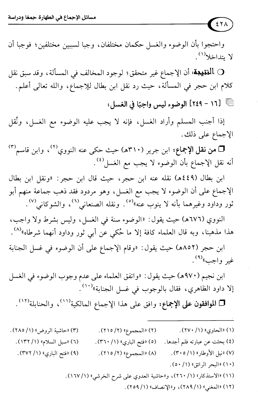 ابن حجر (852 هـ) حيث يقول: "وقام الإجماع على أن الوضوء في غسل الجنابة غير واجب" (¬9).