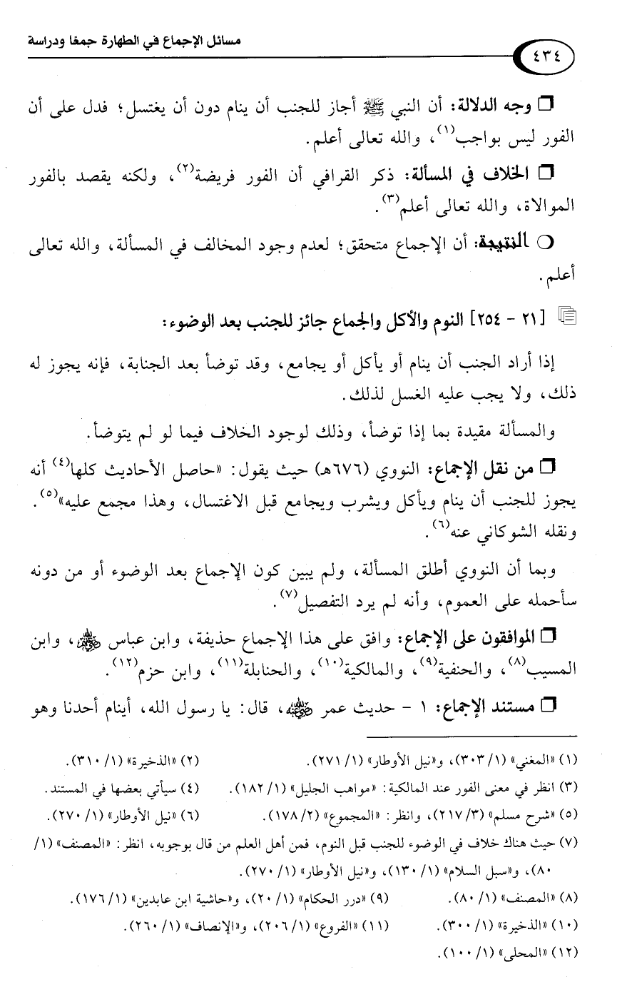 • من نقل الإجماع: النووي (676 هـ) حيث يقول: "حاصل الأحاديث كلها (¬4) أنه يجوز للجنب أن ينام ويأكل ويشرب ويجامع قبل الاغتسال، وهذا مجمع عليه" (¬5). ونقله الشوكاني عنه (¬6).