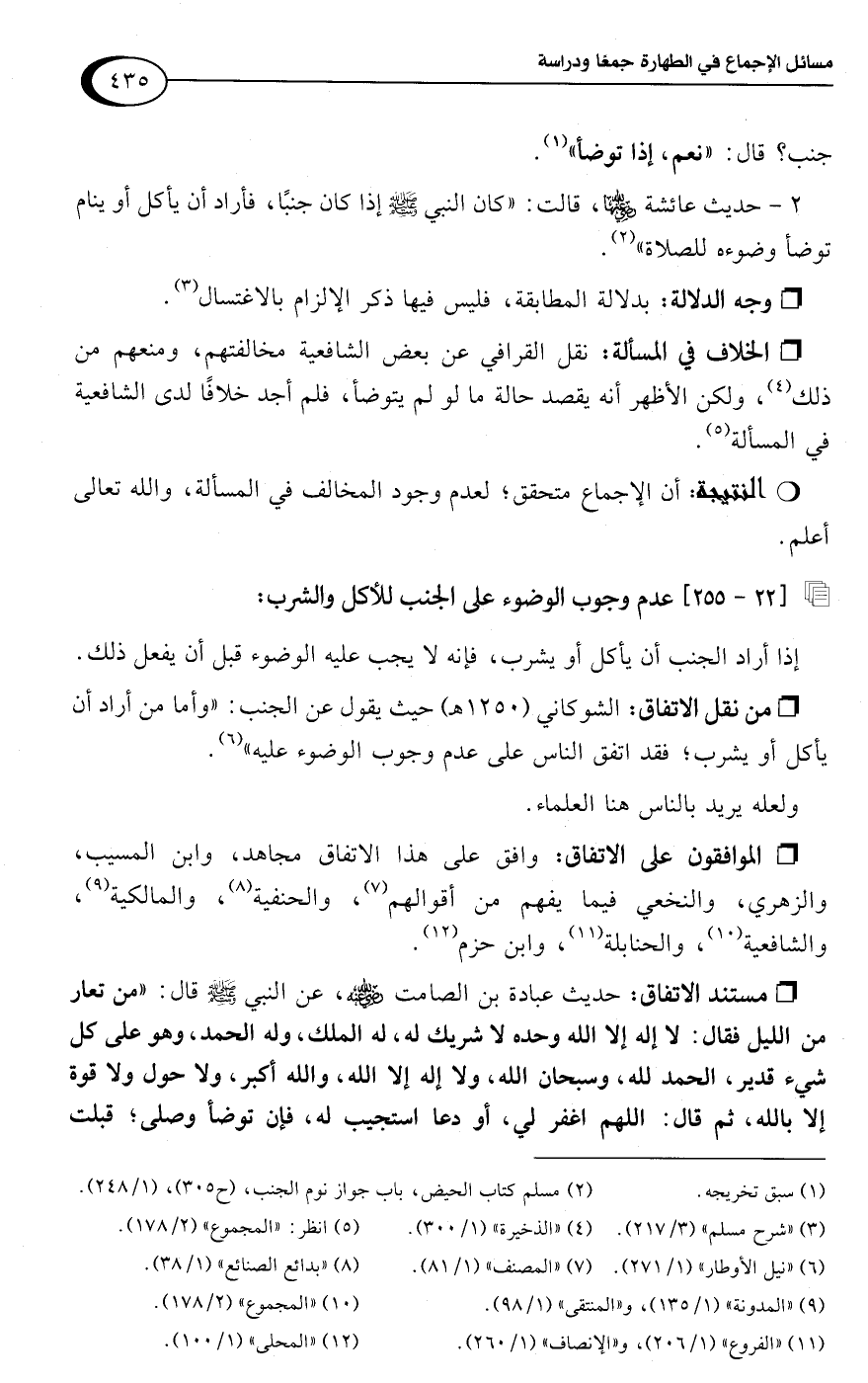 • الخلاف في المسألة: نقل القرافي عن بعض الشافعية مخالفتهم، ومنعهم من ذلك (¬4)، ولكن الأظهر أنه يقصد حالة ما لو لم يتوضأ، فلم أجد خلافًا لدى الشافعية في المسألة (¬5).Rأن الإجماع متحقق؛ لعدم وجود المخالف في المسألة، واللَّه تعالى أعلم.