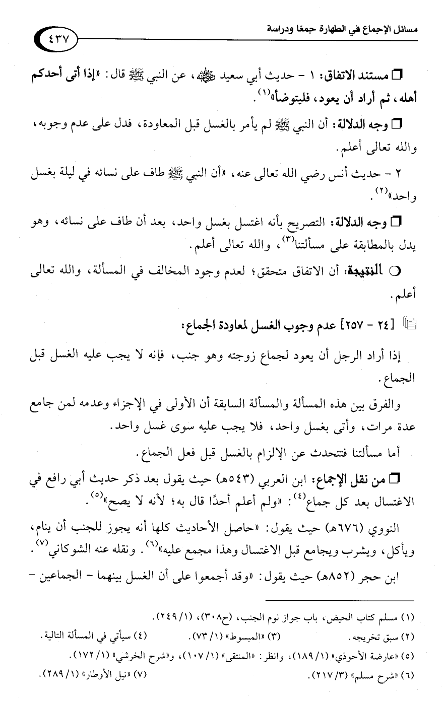 • وجه الدلالة: التصريح بأنه اغتسل بغسل واحد، بعد أن طاف على نسائه، وهو يدل بالمطابقة على مسألتنا (¬3)، واللَّه تعالى أعلم.Rأن الاتفاق متحقق؛ لعدم وجود المخالف في المسألة، واللَّه تعالى أعلم.