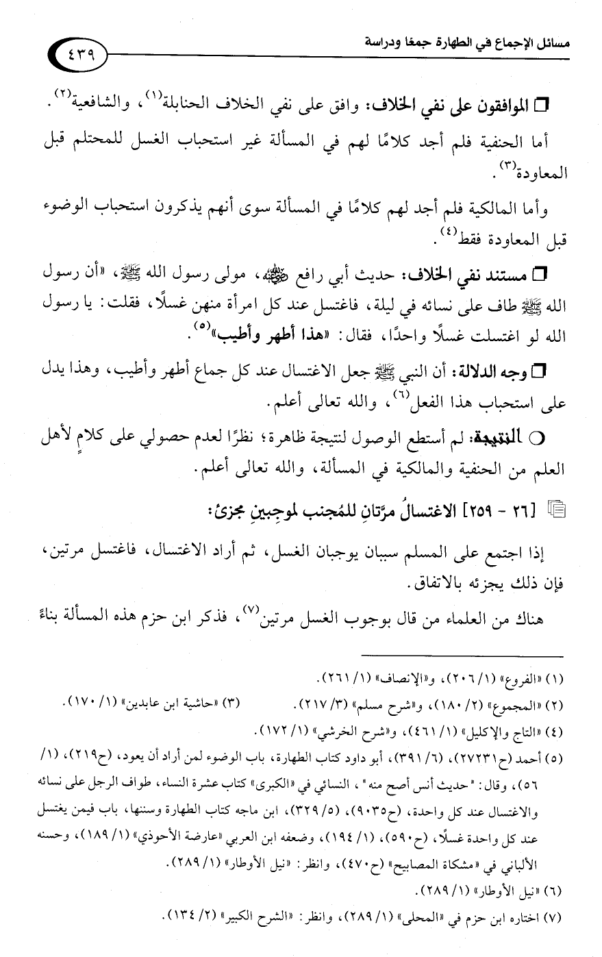 • مستند نفي الخلاف: حديث أبي رافع -رضي اللَّه عنه-، مولى رسول اللَّه -صلى اللَّه عليه وسلم-، "أن رسول اللَّه -صلى اللَّه عليه وسلم- طاف على نسائه في ليلة، فاغتسل عند كل امرأة منهن غسلًا، فقلت: يا رسول اللَّه لو اغتسلت غسلًا واحدًا، فقال: "هذا أطهر وأطيب" (¬5).